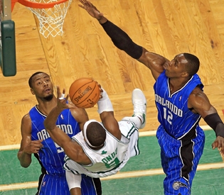 Seattle’s own Nate Robinson came off the bench in the 2nd quauter to spark the Celtics. The crowd went crazy with little Nate hitting three pointers and dishing to KG for baskets. He even drove the lane on big Howard like he wanted to dunk over him!!! No lie.