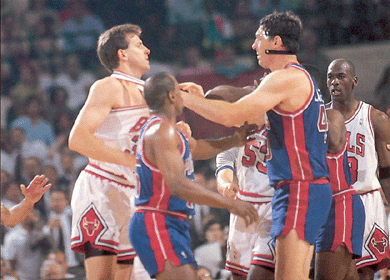 I remember seeing the “Bad Boys” roughing up MJ in the playoffs. The had a rule called the “Jordan Rule” Which means no easy dunks or fantastic plays in the key without a hard foul by Rodman or Big Bill or or other Pistons.